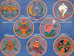 - Roue, conque, bannière, parasol, lotus, urne, poissons, nœud.