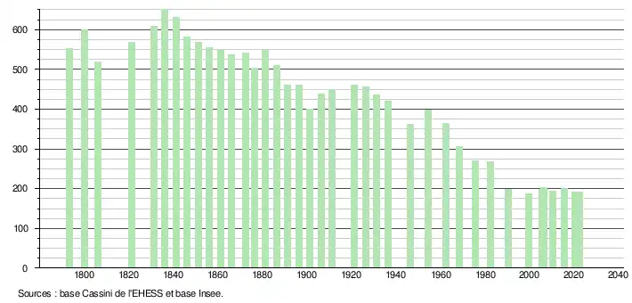 L'évolution du nombre d'habitants est connue à travers les recensements de la population effectués dans la commune depuis 1793. Pour les communes de moins de 10 000 habitants, une enquête de recensement portant sur toute la population est réalisée tous les cinq ans, les populations de référence des années intermédiaires étant quant à elles estimées par interpolation ou extrapolation[20]. Pour la commune, le premier recensement exhaustif entrant dans le cadre du nouveau dispositif a été réalisé en 2005[21].