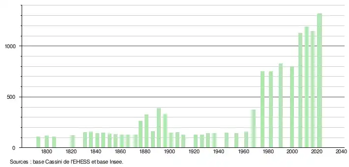 L'évolution du nombre d'habitants est connue à travers les recensements de la population effectués dans la commune depuis 1793. Pour les communes de moins de 10 000 habitants, une enquête de recensement portant sur toute la population est réalisée tous les cinq ans, les populations de référence des années intermédiaires étant quant à elles estimées par interpolation ou extrapolation[13]. Pour la commune, le premier recensement exhaustif entrant dans le cadre du nouveau dispositif a été réalisé en 2006[14].
