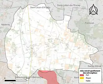 Le retrait-gonflement des sols argileux est susceptible d'engendrer des dommages importants aux bâtiments en cas d’alternance de périodes de sécheresse et de pluie. 0,4 % de la superficie communale est en aléa moyen ou fort (54,2 % au niveau départemental et 48,5 % au niveau national). Sur les 568 bâtiments dénombrés sur la commune en 2019, 5 sont en aléa moyen ou fort, soit 1 %, à comparer aux 57 % au niveau départemental et 54 % au niveau national. Une cartographie de l'exposition du territoire national au retrait gonflement des sols argileux est disponible sur le site du BRGM[11],[Carte 2].