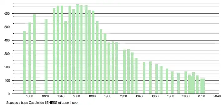 L'évolution du nombre d'habitants est connue à travers les recensements de la population effectués dans la commune depuis 1793. Pour les communes de moins de 10 000 habitants, une enquête de recensement portant sur toute la population est réalisée tous les cinq ans, les populations de référence des années intermédiaires étant quant à elles estimées par interpolation ou extrapolation[15]. Pour la commune, le premier recensement exhaustif entrant dans le cadre du nouveau dispositif a été réalisé en 2004[16].