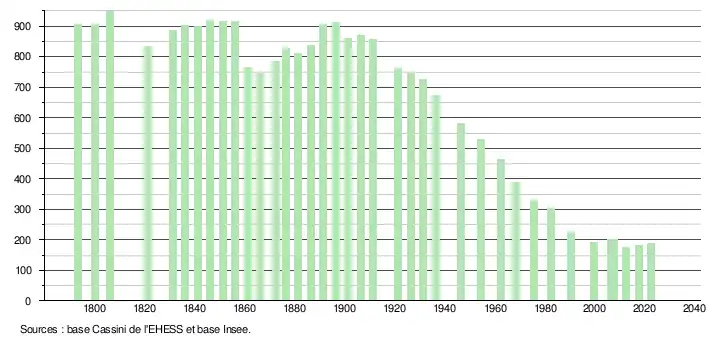 L'évolution du nombre d'habitants est connue à travers les recensements de la population effectués dans la commune depuis 1793. Pour les communes de moins de 10 000 habitants, une enquête de recensement portant sur toute la population est réalisée tous les cinq ans, les populations de référence des années intermédiaires étant quant à elles estimées par interpolation ou extrapolation[25]. Pour la commune, le premier recensement exhaustif entrant dans le cadre du nouveau dispositif a été réalisé en 2007[26].