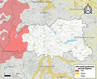 Les mouvements de terrains susceptibles de se produire sur la commune sont des tassements différentiels[18]. Le retrait-gonflement des sols argileux est susceptible d'engendrer des dommages importants aux bâtiments en cas d’alternance de périodes de sécheresse et de pluie[19]. 16,4 % de la superficie communale est en aléa moyen ou fort (79,5 % au niveau départemental et 48,5 % au niveau national)[Carte 2]. Depuis le , en application de la loi ÉLAN, différentes contraintes s'imposent aux vendeurs, maîtres d'ouvrages ou constructeurs de biens situés dans une zone classée en aléa moyen ou fort[Note 2],[20].