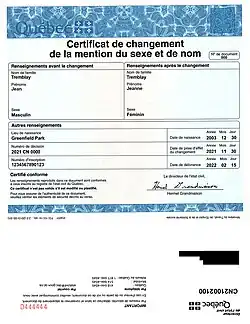 La Cour supérieure du Québec invalide le jeudi plusieurs articles du code civil du Québec jugés discriminatoires à l'égard des personnes trans ou non binaires. Le gouvernement dispose jusqu’au pour proposer l'adoption de nouveaux textes. Cet arrêt permet désormais aux personnes trans de changer leur identité dans les documents de l’état civil. Par ailleurs, les personnes non binaires disposeront d'une existence juridique pour l’état civil. Ainsi, la Direction de l’état civil devra offrir d’autres options que « homme » ou « femme » pour désigner l’identité de genre. Le législateur l'établira par un nouveau texte. La cour juge que les articles 111, 115 et 116 du code civil obligeant un parent non binaire d’être identifié comme « mère » ou « père » d’un enfant — plutôt que comme « parent » — « violent la dignité et le droit à l’égalité » de cette personne. Elle considère également que le législateur doit modifier la section 23 du règlement relatif au changement de nom et d’autres qualités de l’état civil. En effet, cet article prévoit que la « demande de changement de la mention du sexe d’un enfant mineur [de 14 à 17 ans] doit être accompagnée d’une lettre d’un médecin, d’un psychologue, d’un psychiatre, d’un sexologue ou d’un travailleur social […], qui déclare avoir évalué ou suivi l’enfant et qui est d’avis que le changement de cette mention est approprié » alors que cela a été aboli pour les adultes[114].