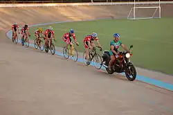 - le keirin : les cyclistes restent derrière un derny, une moto ou un tandem jusqu'à atteindre 50 km/h, à 600 mètres de l'arrivée, où commence le sprint final ;