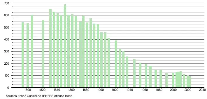 L'évolution du nombre d'habitants est connue à travers les recensements de la population effectués dans la commune depuis 1793. Pour les communes de moins de 10 000 habitants, une enquête de recensement portant sur toute la population est réalisée tous les cinq ans, les populations de référence des années intermédiaires étant quant à elles estimées par interpolation ou extrapolation[18]. Pour la commune, le premier recensement exhaustif entrant dans le cadre du nouveau dispositif a été réalisé en 2004[19].