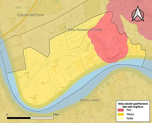 Le retrait-gonflement des sols argileux est susceptible d'engendrer des dommages importants aux bâtiments en cas d’alternance de périodes de sécheresse et de pluie. 87,9 % de la superficie communale est en aléa moyen ou fort (67,4 % au niveau départemental et 48,5 % au niveau national). Sur les 215 bâtiments dénombrés sur la commune en 2019, 215 sont en aléa moyen ou fort, soit 100 %, à comparer aux 84 % au niveau départemental et 54 % au niveau national. Une cartographie de l'exposition du territoire national au retrait gonflement des sols argileux est disponible sur le site du BRGM[27],[Carte 2].