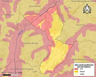 Le retrait-gonflement des sols argileux est susceptible d'engendrer des dommages importants aux bâtiments en cas d’alternance de périodes de sécheresse et de pluie. La totalité de la commune est en aléa moyen ou fort (92 % au niveau départemental et 48,5 % au niveau national). Sur les 63 bâtiments dénombrés sur la commune en 2019, 63 sont en aléa moyen ou fort, soit 100 %, à comparer aux 96 % au niveau départemental et 54 % au niveau national. Une cartographie de l'exposition du territoire national au retrait gonflement des sols argileux est disponible sur le site du BRGM[24],[Carte 2].