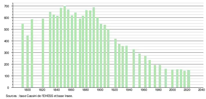 L'évolution du nombre d'habitants est connue à travers les recensements de la population effectués dans la commune depuis 1793. Pour les communes de moins de 10 000 habitants, une enquête de recensement portant sur toute la population est réalisée tous les cinq ans, les populations de référence des années intermédiaires étant quant à elles estimées par interpolation ou extrapolation[29]. Pour la commune, le premier recensement exhaustif entrant dans le cadre du nouveau dispositif a été réalisé en 2006[30].