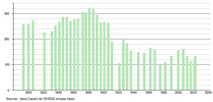 L'évolution du nombre d'habitants est connue à travers les recensements de la population effectués dans la commune depuis 1793. Pour les communes de moins de 10 000 habitants, une enquête de recensement portant sur toute la population est réalisée tous les cinq ans, les populations de référence des années intermédiaires étant quant à elles estimées par interpolation ou extrapolation[27]. Pour la commune, le premier recensement exhaustif entrant dans le cadre du nouveau dispositif a été réalisé en 2006[28].