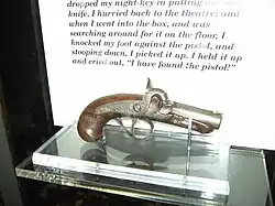 Booth connaît bien la pièce qui se joue sur la scène et il attend le moment où, à l'acte III, scène 2[45], l'acteur Harry Hawk, qui interprète le rôle d'Asa Trenchard, le cousin d'Amérique un peu rustre mais sympathique, dira son fait à l'insupportable Mrs Mountchessington qui pose, hautaine, à la grande dame anglaise : le franc-parler d'Asa Trenchard, son fort accent populaire et très américain déchaînent toujours la joie et l'hilarité du public dont le brouhaha couvrira la détonation. Alors que Hawk s'exclame : « Quoi, moi, je ne connais pas les manières de la bonne société ? Mais je crois bien que j'en connais assez pour vous dire vos quatre vérités, ma vieille ! Espèce de vieille croqueuse d'homme manipulatrice ! »[N 3], Booth se précipite et tire sur la tête du président[46]. Mortellement blessé, Lincoln s'effondre sur son siège. Rathbone se lève et bondit pour empêcher Booth de s'échapper, mais celui-ci lui donne un violent coup de poignard dans le bras[47]. Rathbone se ressaisit rapidement et tente d'agripper Booth qui se prépare à enjamber la balustrade de la loge. Booth lui assène un nouveau coup et entreprend de sauter sur la scène. Rathbone rapidement se redressa sur son siège et saisit le manteau de Booth alors qu'il s'apprêtait à sauter du rebord de la boîte. Booth est tombé sur le rail de la boîte vers le bas à l'étage inférieur (environ une chute de douze pieds, soit 3.65 mètres). Dans la foulée, son éperon d'équitation s'est empêtré sur le drapeau du Trésor décoration de la boîte, et il a atterri maladroitement sur son pied gauche, fracturé le péroné gauche, juste au-dessus de la cheville. Il parvient à se relever et, brandissant son couteau, il s'écrie : « Sic semper tyrannis ! »[48],[49] la devise latine de la Virginie qui signifie « Ainsi en est-il toujours des tyrans ! » Selon d'autres versions, il ajoute : « Le Sud est vengé ! »[50] Il court ensuite sur la scène et regagne la porte par laquelle il est entré dans le théâtre et où l'attend son cheval. Quelques spectateurs se lancent à sa poursuite mais ne parviennent pas à l'attraper. Booth frappe Joseph Burroughs au front avec le manche de son poignard, saute sur sa monture et s'enfuit bride abattue. Il galope jusqu'au Navy Yard Bridge, qui traverse l'Anacostia, et vers son rendez-vous avec Herold et Powell.
