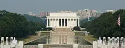 L'association du Lincoln Monument, dont le but est la création d'un mémorial dédié au président, est agréée par le Congrès des États-Unis en mars 1867[105]. Ce n'est qu'en 1901 qu'un site lui est dédié, sur une parcelle qui n'est alors qu'une zone marécageuse de Washington[105], et se trouve aujourd'hui dans le West Potomac Park. Le Congrès donne son accord formel à l'érection du mémorial le . La première pierre est posée le jour anniversaire de la naissance de Lincoln, le [106]. Les travaux sont toutefois retardés en raison de la Première Guerre mondiale et ce n'est que le qu'est inauguré le Lincoln Memorial conçu par Henry Bacon[106]. Ouvert au public depuis lors, il a reçu 4,7 millions de visiteurs en 2008[107]. Londres abrite également une tour en mémoire d'Abraham Lincoln, la Lincoln Memorial Tower[108].
