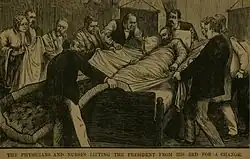 Le président Garfield avec James Blaine après les coups de feu de Charles J. Guiteau[1],[2]. | |||