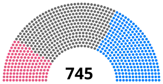 Le pouvoir législatif, interprète de la nation, se trouve être le premier pouvoir de l’État[32]. Celui-ci est confié à une Assemblée unique élue, pour une législature de deux ans, au suffrage censitaire à deux degrés : l’Assemblée législative. Constituée par 745 députés, ses pouvoirs sont importants et elle domine la royauté[33]. Cette deuxième Assemblée de la Révolution a l’initiative des lois et vote, après trois lectures, les décrets que le roi, par sa sanction, transforme en loi[24].