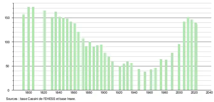 L'évolution du nombre d'habitants est connue à travers les recensements de la population effectués dans la commune depuis 1793. Pour les communes de moins de 10 000 habitants, une enquête de recensement portant sur toute la population est réalisée tous les cinq ans, les populations de référence des années intermédiaires étant quant à elles estimées par interpolation ou extrapolation[20]. Pour la commune, le premier recensement exhaustif entrant dans le cadre du nouveau dispositif a été réalisé en 2006[21].