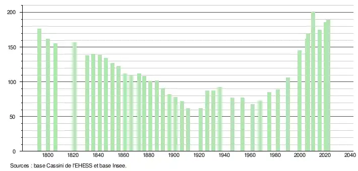 L'évolution du nombre d'habitants est connue à travers les recensements de la population effectués dans la commune depuis 1793. Pour les communes de moins de 10 000 habitants, une enquête de recensement portant sur toute la population est réalisée tous les cinq ans, les populations de référence des années intermédiaires étant quant à elles estimées par interpolation ou extrapolation[17]. Pour la commune, le premier recensement exhaustif entrant dans le cadre du nouveau dispositif a été réalisé en 2005[18].