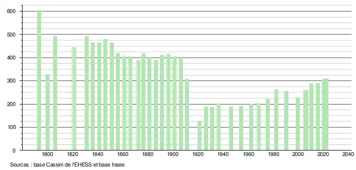 L'évolution du nombre d'habitants est connue à travers les recensements de la population effectués dans la commune depuis 1793. Pour les communes de moins de 10 000 habitants, une enquête de recensement portant sur toute la population est réalisée tous les cinq ans, les populations de référence des années intermédiaires étant quant à elles estimées par interpolation ou extrapolation[32]. Pour la commune, le premier recensement exhaustif entrant dans le cadre du nouveau dispositif a été réalisé en 2005[33].