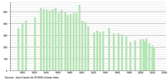 L'évolution du nombre d'habitants est connue à travers les recensements de la population effectués dans la commune depuis 1793. Pour les communes de moins de 10 000 habitants, une enquête de recensement portant sur toute la population est réalisée tous les cinq ans, les populations de référence des années intermédiaires étant quant à elles estimées par interpolation ou extrapolation[28]. Pour la commune, le premier recensement exhaustif entrant dans le cadre du nouveau dispositif a été réalisé en 2004[29].