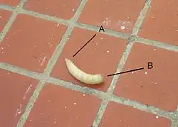 Les asticots sont généralement longs de 4 à 12 mm selon leur stade de développement. La plupart des asticots sont de couleur blanchâtre ou légèrement brune, mais certaines espèces ont des asticots jaunes ou rougeâtres. Les asticots sont acéphales mais ils possèdent une paire de petits crochets qui les aident à se nourrir. Ils n'ont pas de pattes non plus.