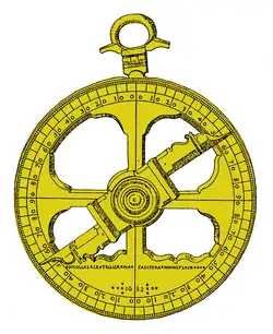 L'astrolabe nautique est probablement inspiré de l'astrolabe planisphérique[1] dont il conserve la forme générale mais, comme il sert à déterminer la latitude, il ne possède ni tympans ni araignée[N 1]. L'astrolabe nautique ne comprend donc que deux pièces principales, l'astrolabe proprement dit[N 2] et l'alidade qui doivent assurer la seule fonction d'usage de l'instrument : mesurer une hauteur méridienne du Soleil, ce qui, en langage maritime, s'appelle « peser le Soleil ».