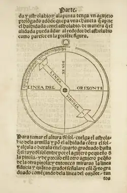 En 1545, Martín Cortés de Albacar écrit Le premier ouvrage consacré en partie à l'astrolabe nautique. Imprimé en 1551 il y représente un instrument, réduit au minimum, constitué d'un disque plein avec une alidade où chacune des deux pinnules sont percées de deux œilletons différents : l'un, de petit diamètre, pour prendre la hauteur du Soleil, l'autre, de plus grande ouverture pour viser les étoiles ; ce serait la première description et le premier mode de construction imprimés de l'astrolabe nautique[23].
