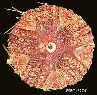 C'est un grand oursin au test (coquille) rouge et aux radioles (piquants) souvent fortement colorées, sur une gamme allant du beige au violet profond en passant par de nombreuses nuances de rouge d'orange : les individus les plus jeunes sont les plus clairs et les plus colorés, et ils foncent avec l'âge pour devenir rouge sombre ou violets, parfois presque noirs[1]. Sa forme est légèrement aplatie, et les très longues épines (crème annelées de rouge chez les jeunes, puis sombres et plus unies chez les adultes) regroupées en « mèches » laissent apparaître cinq zones nues en forme de chevrons d'un blanc pur (allant jusqu'au jaune doré chez les spécimens les plus sombres)[1]. Ces zones sont en fait les aires interambulacraires, et sont bordées de points bleus iridescents très lumineux (mais non bioluminescents). Les piquants, longs, fins et creux, sont annelés chez les jeunes individus, et foncent avec l'âge jusqu'à parfois disparaître chez les individus les plus sombres ; ils sont de deux sortes, les plus longs servant principalement à la locomotion et les plus courts à la défense, équipés de glandes à venin.