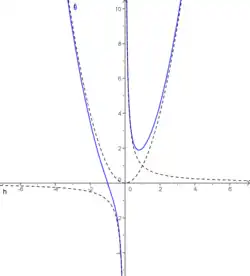 Courbe d'équation y = 1+4(x2 – 1)/x4 et sa droite asymptote (d) : y = 1. Courbe et droite se rencontrent pour x = 1.