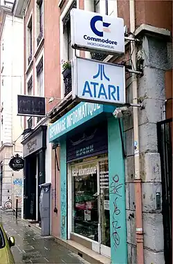 Devanture d'un revendeur spécialisé en informatique témoignant de la guerre commerciale entre Atari et Commodore - Grenoble (2013).