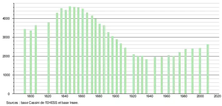 - ↑ Dans le tableau des recensements et le graphique, par convention dans Wikipédia, le principe a été retenu, pour les populations légales postérieures à 1999 de n’afficher dans le tableau des recensements et le graphique que les populations correspondant à l'année 2006, première population légale publiée calculée conformément aux concepts définis dans le décret no 2003-485 du 5 juin 2003, et les années correspondant à une enquête exhaustive de recensement pour les communes de moins de 10 000 habitants, ainsi que la dernière population légale publiée par l’Insee.