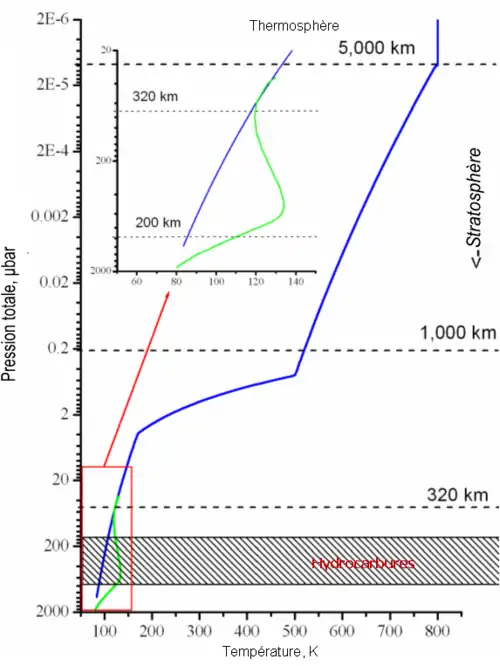 La troposphère est la partie la plus basse et la plus dense de l'atmosphère et est caractérisée par une diminution de la température avec l'altitude[1]. La température tombe de 320 K à la base de la troposphère située à −300 km à près de 53 K à 50 km[2],[4]. Les températures dans la haute région de la troposphère (la tropopause) varient entre 49 et 57 K suivant la latitude, les plus basses étant atteintes à 25° de latitude sud[1],[5]. La troposphère détient presque toute la masse de l'atmosphère, et la tropopause est la cause de la majorité des émissions infrarouges, déterminant donc sa température effective de 59.1 ± 0.3 K[5],[6].