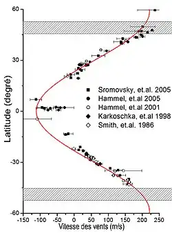 Le déplacement de nombreux nuages a permis de déterminer des vents zonaux soufflant dans la troposphère supérieure d'Uranus[9]. À l'équateur les vents sont rétrogrades, ce qui signifie qu'ils soufflent dans la direction opposée à la rotation de la planète. Leur vitesse va de −100 à −50 m/s[9],[27]. La vitesse des vents augmente en s'éloignant de l'équateur, atteignant zéro près de ±20° latitude, où la température de la troposphère est minimale[5],[9]. Près des pôles, les vents se déplacent de façon prograde (dans le sens de rotation de la planète). La vitesse des vents continue d'augmenter jusqu'à son maximum à ±60° de latitude avant de retomber à zéro aux pôles[9]. La vitesse des vents à −40° de latitude est de 150 à 200 m/s. Puisque le col empêche d'observer les nuages en dessous de ce parallèle, la vitesse des vents entre −40° de latitude et le pôle sud est impossible à mesurer[9]. En opposition, dans l'hémisphère nord des vitesses allant jusqu'à 240 m/s sont observées vers +50 degrés de latitude[9],[27]. Ces vitesses mènent parfois aux affirmations incorrectes selon lesquelles les vents sont plus rapides dans l'hémisphère nord. En fait, latitude par latitude, les vents sont légèrement plus lents au nord d'Uranus, spécialement entre ±20 et ±40 degrés[9].
