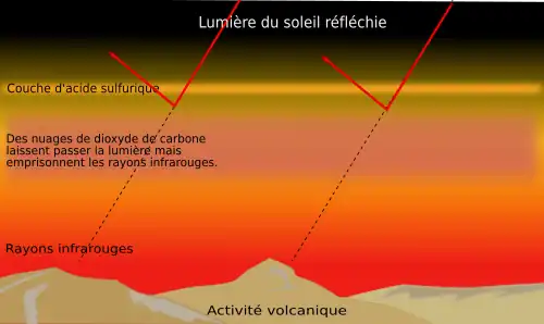 Le dioxyde de carbone, constituant majoritaire de l'atmosphère vénusienne, est le principal responsable de l'effet de serre sur Vénus. Mais la couverture nuageuse, la vapeur d'eau, même si elle est en faible quantité, et le dioxyde de soufre y contribuent également[31],[32].