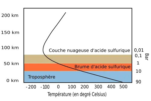 L'atmosphère est divisée en plusieurs sections suivant l'altitude. La partie la plus dense, la troposphère, commence à la surface et s'étend jusqu'à près de 65 km d'altitude. À la surface, les vents sont lents[3] mais, au plus haut de la troposphère, la température et la pression sont similaires à celle de la Terre et les nuages vont à la vitesse de 100 m/s[13].