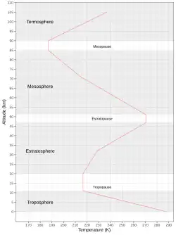 - dans la haute stratosphère, entre 32 et 47 km d'altitude, la température croît linéairement de +2,8 °C par km, atteignant −2,5 °C à 47 km ;