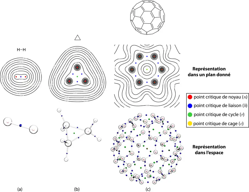 - Point critique de type , noté : trois valeurs propres positives. Indique la présence d'une cage (indiqué dans le cas du fullerène en figure 2 (c)).