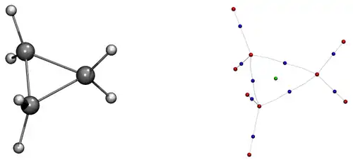 - Point critique de type , noté : une valeur propre négative et deux valeurs propres positives. Indique la présence d'un cycle (indiqué dans le cas du cyclopropane et du fullerène, figure 2 (b, c)).