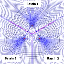 AIM définit alors le bassin d'un "attracteur", ou tout simplement bassin la région de l'espace traversée par les trajectoires du vecteur gradient de la densité électronique aboutissant sur "l'attracteur" correspondant tout simplement à la présence d'un point critique de type indiquant la présence d'un noyau (figure 4).