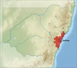 Cette espèce est endémique de Nouvelle-Galles du Sud en Australie[1]. Elle se rencontre à l'Est des Montagnes Bleues de la Georges River jusqu'au lac Tuggerah[2]. Elle est très présente dans la banlieue de Sydney.