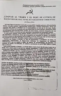 Les tracts ont également appelé au boycott des élections du 6 juin, accusant de trahison ceux qui ont voté pour Keiko Fujimori du parti de droite Force populaire. La première analyse de la direction de la lutte contre le terrorisme a conclu avec le résultat préliminaire que les dépliants pourraient avoir les caractéristiques de la langue utilisée par le Sentier lumineux.