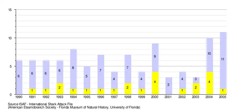 En revanche, si l'on prend les données de l'International Shark Attack File[15], sur la période allant de 1990 à 2005, que l'on peut estimer relativement fiables, 869 cas d'attaques de requin ont dûment été répertoriées dans le monde. Sur ce nombre, 94 se sont révélées mortelles, ce qui concerne donc environ une personne sur dix. Avec ce recul de quinze ans, on s'aperçoit que la moyenne d'attaques de requins dans le monde est de l'ordre de 58 par an, et que le nombre de personnes qui en sont directement décédées est inférieur à 7 par an.