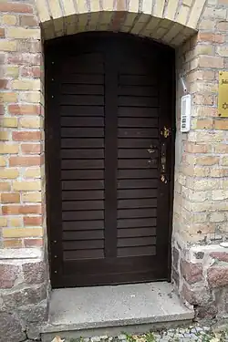 À gauche en arrière-plan la synagogue de Halle ; au premier plan l’entrée du cimetière juif | |||