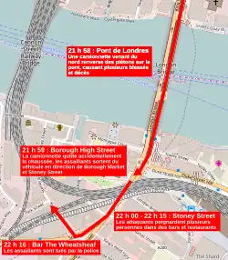 À 22 h 8 UTC+1, la police est alertée après que des témoins ont rapporté la course d'un véhicule heurtant des piétons sur le pont de Londres. Une camionnette Renault de location[2] se dirige vers la rive sud de la Tamise, et des personnes présentes sur le pont ont indiqué aux médias avoir vu le véhicule « zigzaguer » de manière à renverser le plus de piétons possible[3]. Sur Borough High Street (en), la camionnette quitte accidentellement la chaussée, heurtant une clôture et le poteau d'un feu de circulation et ses occupants l'abandonnent sur un trottoir devant le pub et restaurant The Barrowboy & Banker[4] situé au numéro 8 de l'artère, puis se dirigent à pied vers Borough Market. La police arrive sur place en moins de quatre minutes et déploie un important dispositif[5].