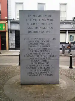 Les attentats de Dublin et Monaghan ont lieu le 17 mai 1974 à Dublin et Monaghan en Irlande, au troisième jour de la grève loyaliste de l'Ulster Workers' Council en Irlande du Nord. Quatre voitures piégées (trois à Dublin, une à Monaghan) explosent à 17 h 30 (Dublin) et 18 h (Monaghan), faisant 33 morts (26 à Dublin, 7 à Monaghan) et 258 blessés[1]. C'est l'attentat le plus meurtrier du conflit nord-irlandais.