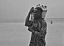 Marchand ambulant à la recherche de clients sur une plage du Kenya.