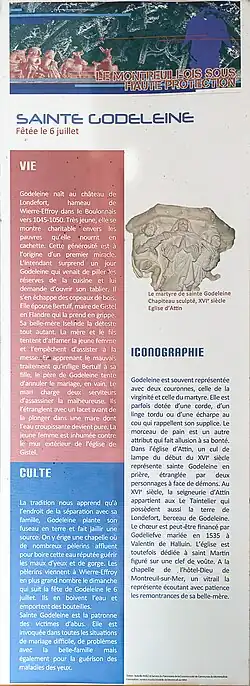 Godeleine est souvent représentée avec deux couronnes, celle de la virginité et celle du martvre. Elle est parfois dotée d'une corde, d'un linge tordu ou d'une écharpe au cou qui rappellent son supplice. Le morceau de pain est un autre attribut qui fait allusion à sa bonté. Dans l'église d'Attin, un cul de lampe du début du XVIe siècle représente sainte Godeleine en prière, étranglée par deux personnages à face de démons. Au XVIe siècle, la seigneurie d'Attin appartient aux Le Taintelier qui possèdent aussi la terre de Londefort, berceau de Godeleine.