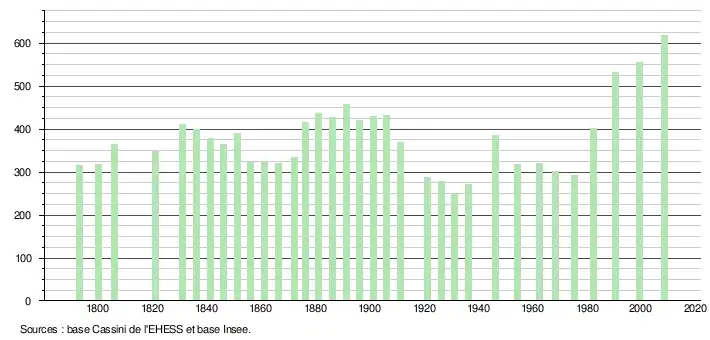 L'évolution du nombre d'habitants est connue à travers les recensements de la population effectués dans la commune depuis 1793. À partir du , les populations légales des communes sont publiées annuellement dans le cadre d'un recensement qui repose désormais sur une collecte d'information annuelle, concernant successivement tous les territoires communaux au cours d'une période de cinq ans. Pour les communes de moins de 10 000 habitants, une enquête de recensement portant sur toute la population est réalisée tous les cinq ans, les populations légales des années intermédiaires étant quant à elles estimées par interpolation ou extrapolation[13]. Pour la commune, le premier recensement exhaustif entrant dans le cadre du nouveau dispositif a été réalisé en 2008[14],[Note 1].