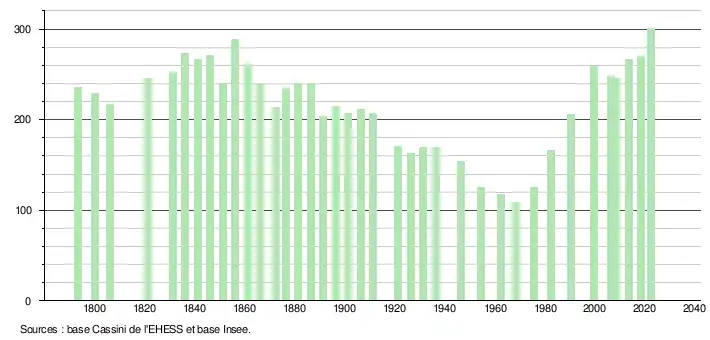 L'évolution du nombre d'habitants est connue à travers les recensements de la population effectués dans la commune depuis 1793. Pour les communes de moins de 10 000 habitants, une enquête de recensement portant sur toute la population est réalisée tous les cinq ans, les populations de référence des années intermédiaires étant quant à elles estimées par interpolation ou extrapolation[28]. Pour la commune, le premier recensement exhaustif entrant dans le cadre du nouveau dispositif a été réalisé en 2008[29].