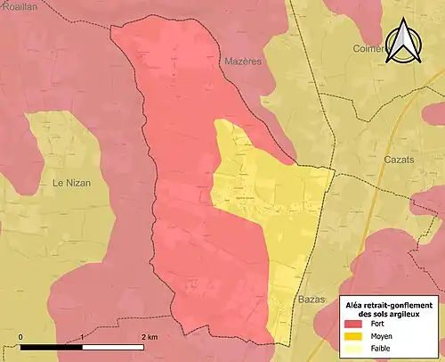 Le retrait-gonflement des sols argileux est susceptible d'engendrer des dommages importants aux bâtiments en cas d’alternance de périodes de sécheresse et de pluie. La totalité de la commune est en aléa moyen ou fort (67,4 % au niveau départemental et 48,5 % au niveau national). Sur les 126 bâtiments dénombrés sur la commune en 2019, 126 sont en aléa moyen ou fort, soit 100 %, à comparer aux 84 % au niveau départemental et 54 % au niveau national. Une cartographie de l'exposition du territoire national au retrait gonflement des sols argileux est disponible sur le site du BRGM[21],[Carte 2].