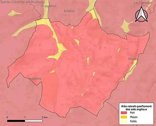 Le retrait-gonflement des sols argileux est susceptible d'engendrer des dommages importants aux bâtiments en cas d’alternance de périodes de sécheresse et de pluie[19]. La totalité de la commune est en aléa moyen ou fort (91,8 % au niveau départemental et 48,5 % au niveau national)[Carte 2]. Depuis le , en application de la loi ELAN, différentes contraintes s'imposent aux vendeurs, maîtres d'ouvrages ou constructeurs de biens situés dans une zone classée en aléa moyen ou fort[Note 4],[20].