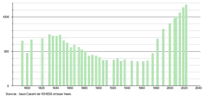 L'évolution du nombre d'habitants est connue à travers les recensements de la population effectués dans la commune depuis 1793. Pour les communes de moins de 10 000 habitants, une enquête de recensement portant sur toute la population est réalisée tous les cinq ans, les populations de référence des années intermédiaires étant quant à elles estimées par interpolation ou extrapolation[25]. Pour la commune, le premier recensement exhaustif entrant dans le cadre du nouveau dispositif a été réalisé en 2008[26].